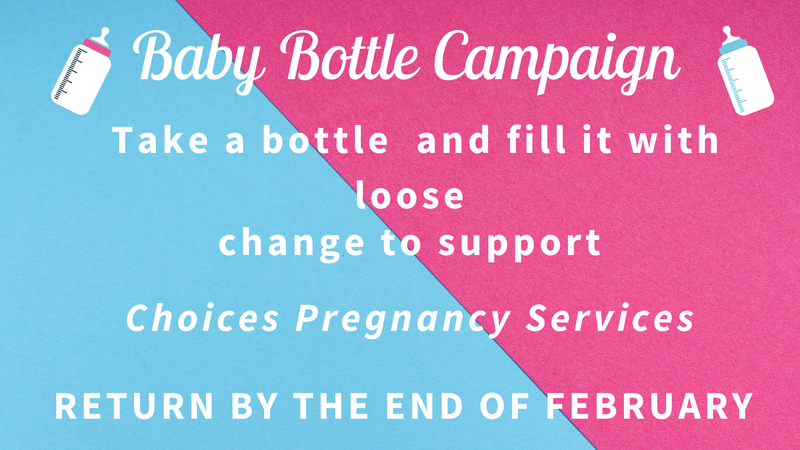 by filling a baby bottle with your monetary donation and returning to the church by the end of February.